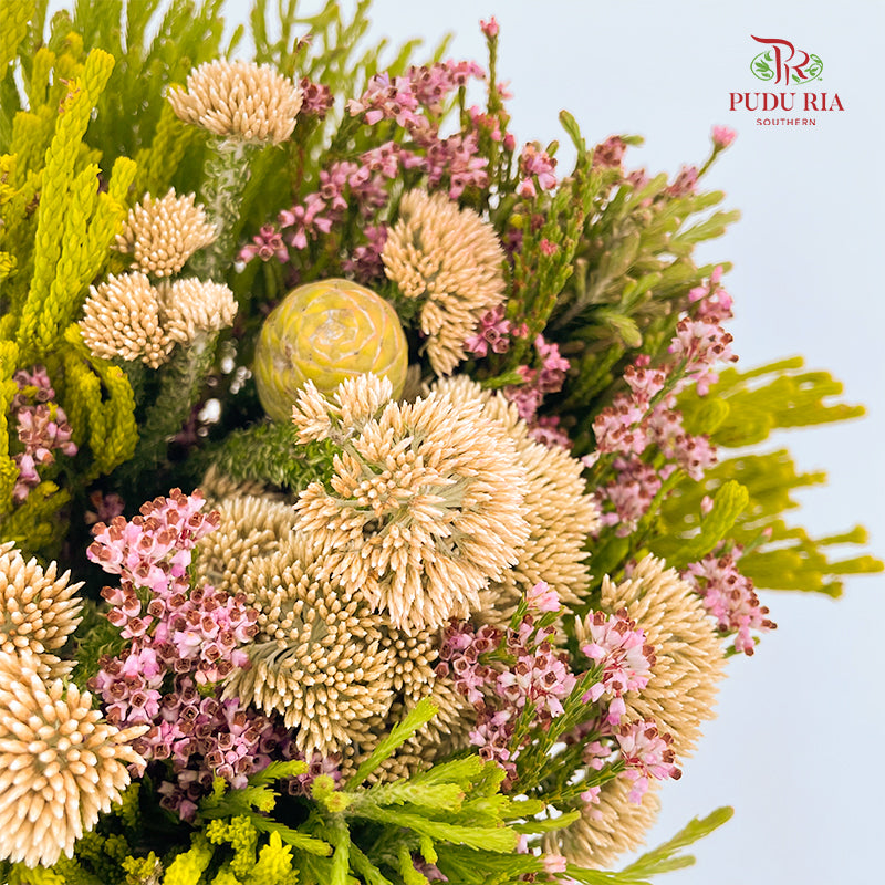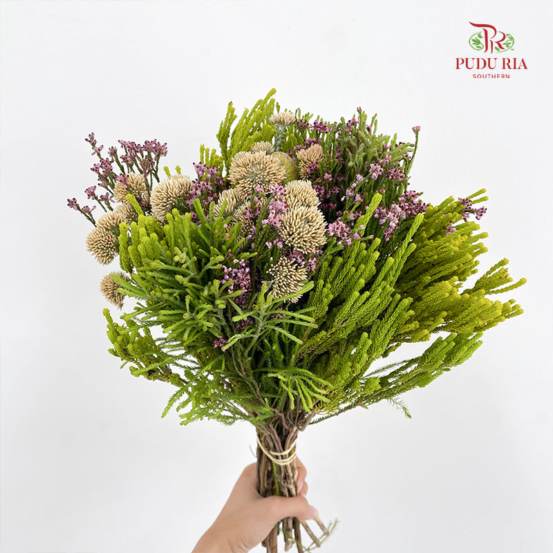 A bunch of Safari flowers. These are all types of flowering plants that are commonly found in South Africa. These flowers create a beautiful and unique bouquet that is popular for special occasions and floral arrangements.